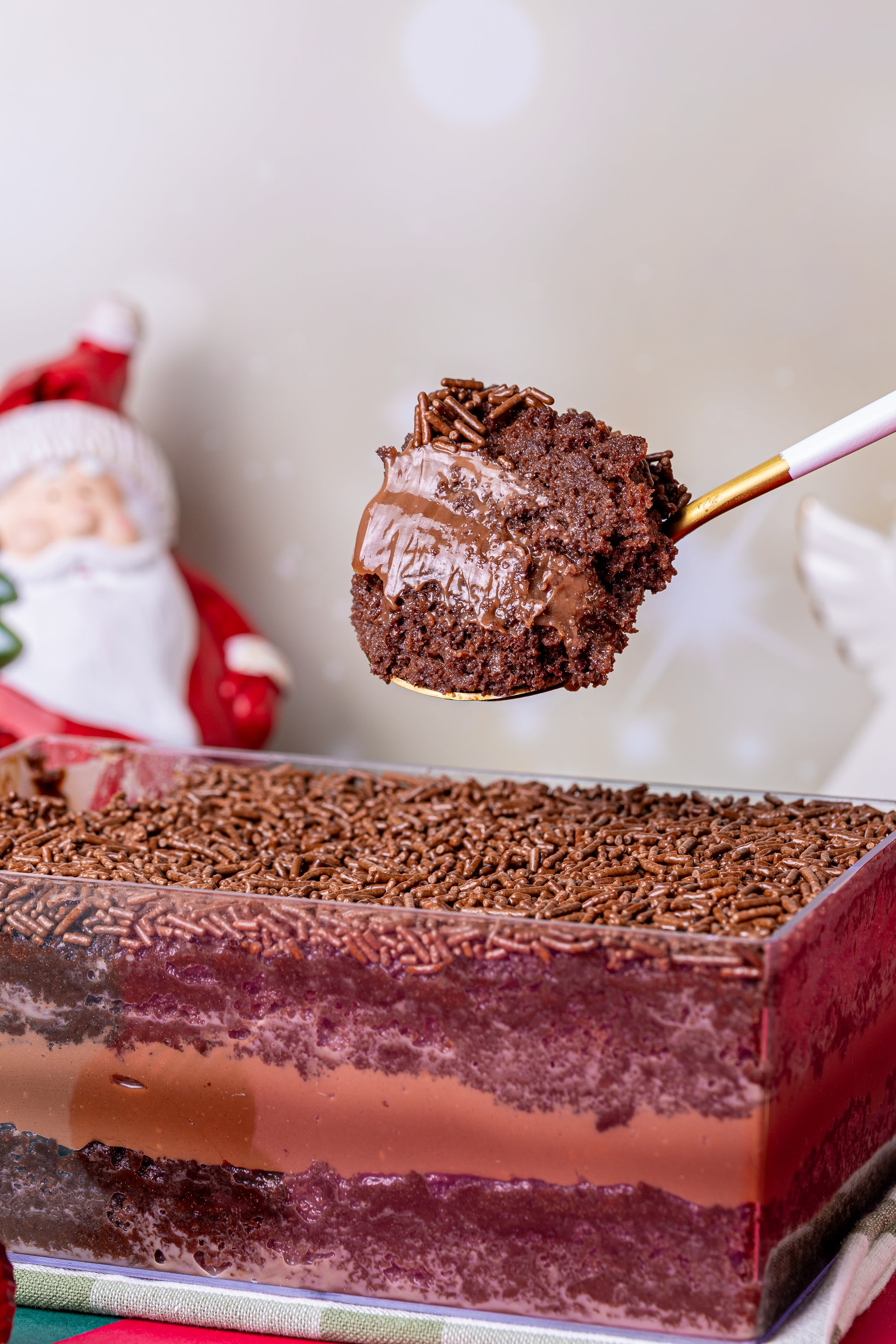 Massa de chocolate úmida e intensa e recheio de brigadeiro cremoso.