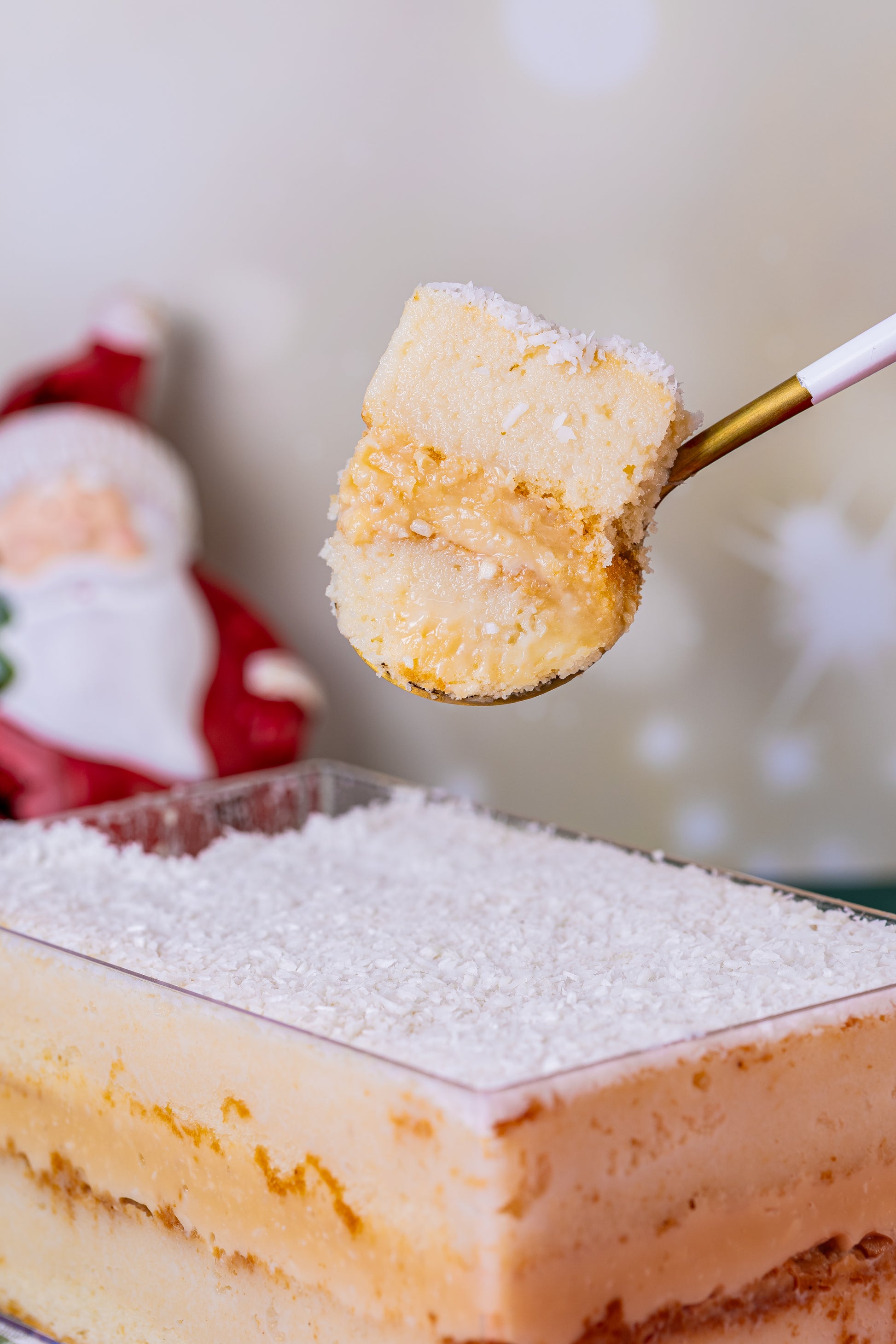 Massa de baunilha bem molhadinha com calda de leite de coco e recheio cremoso de beijinho.