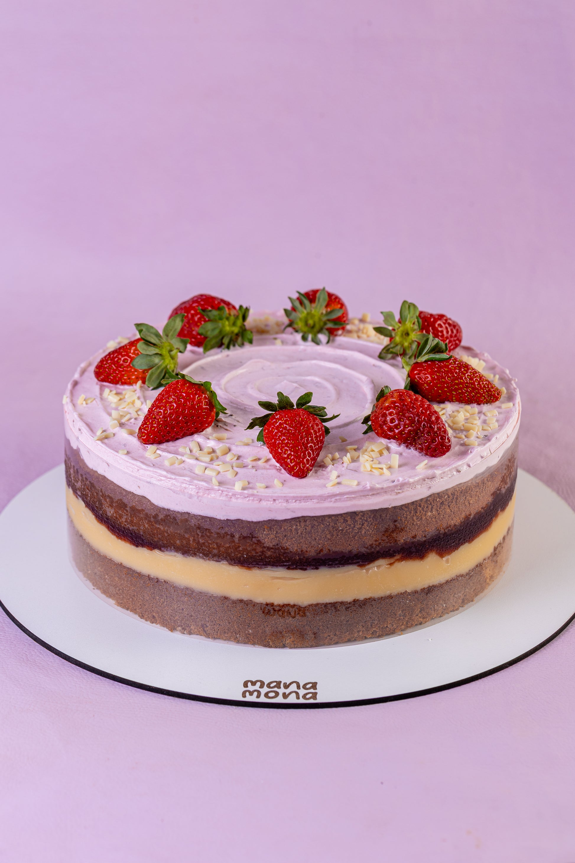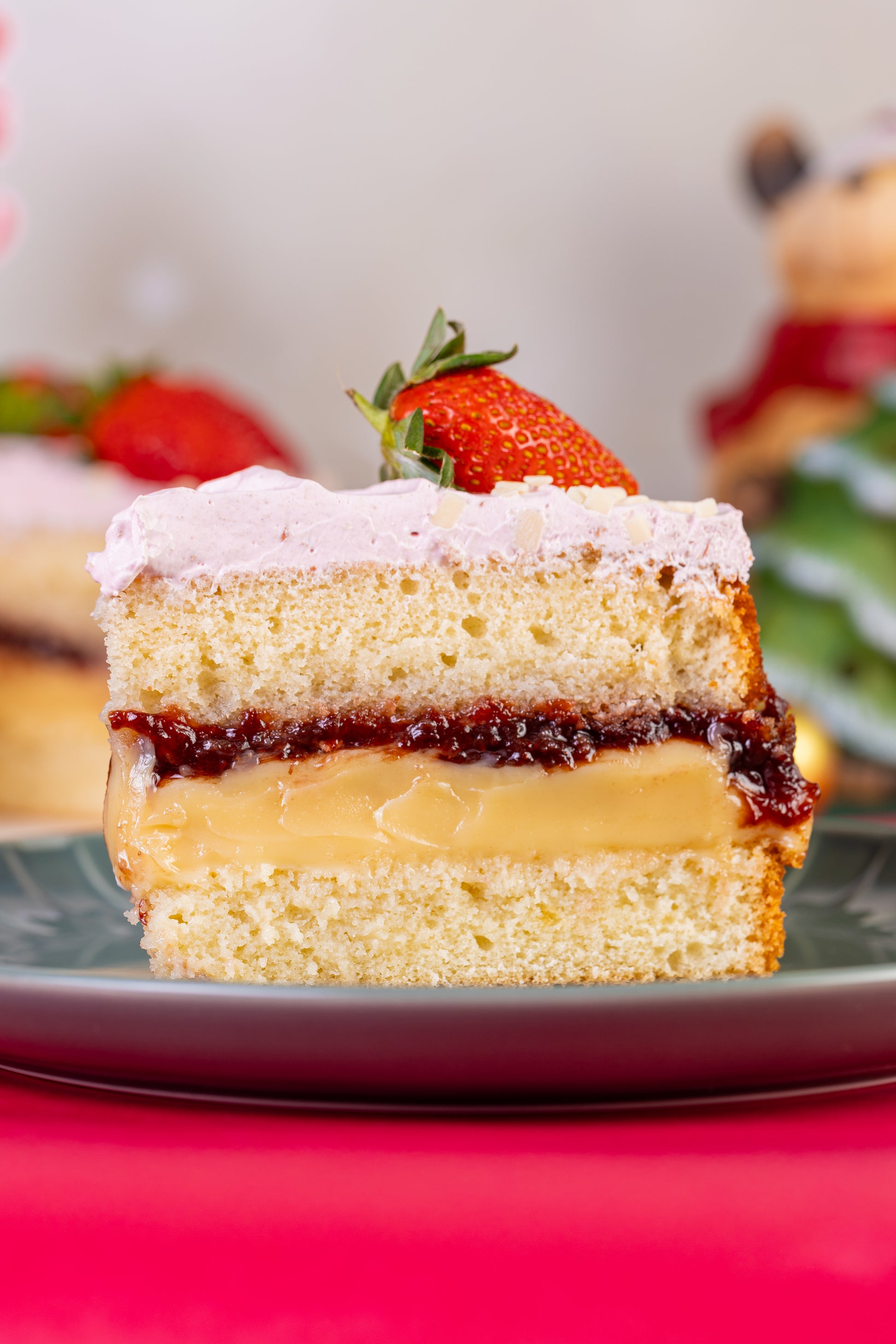 Massa de baunilha com recheio de brigadeiro branco com geléia de morango artesanal e cobertura de chantilly de morango