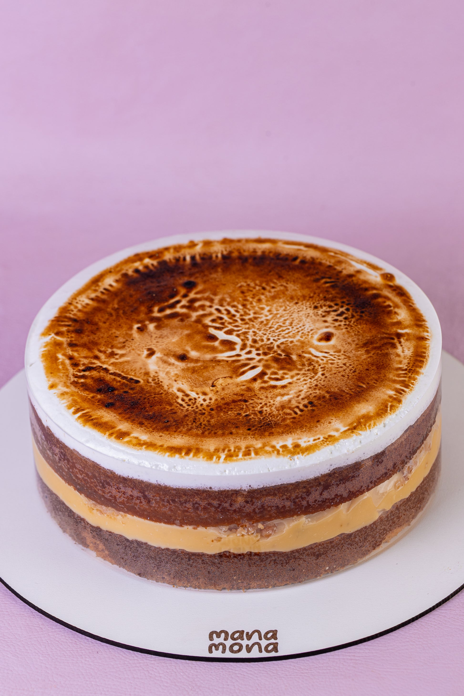 Massa de baunilha com recheio de brigadeiro de limão e crumble crocante, e cobertura de merengue suíço tostado.