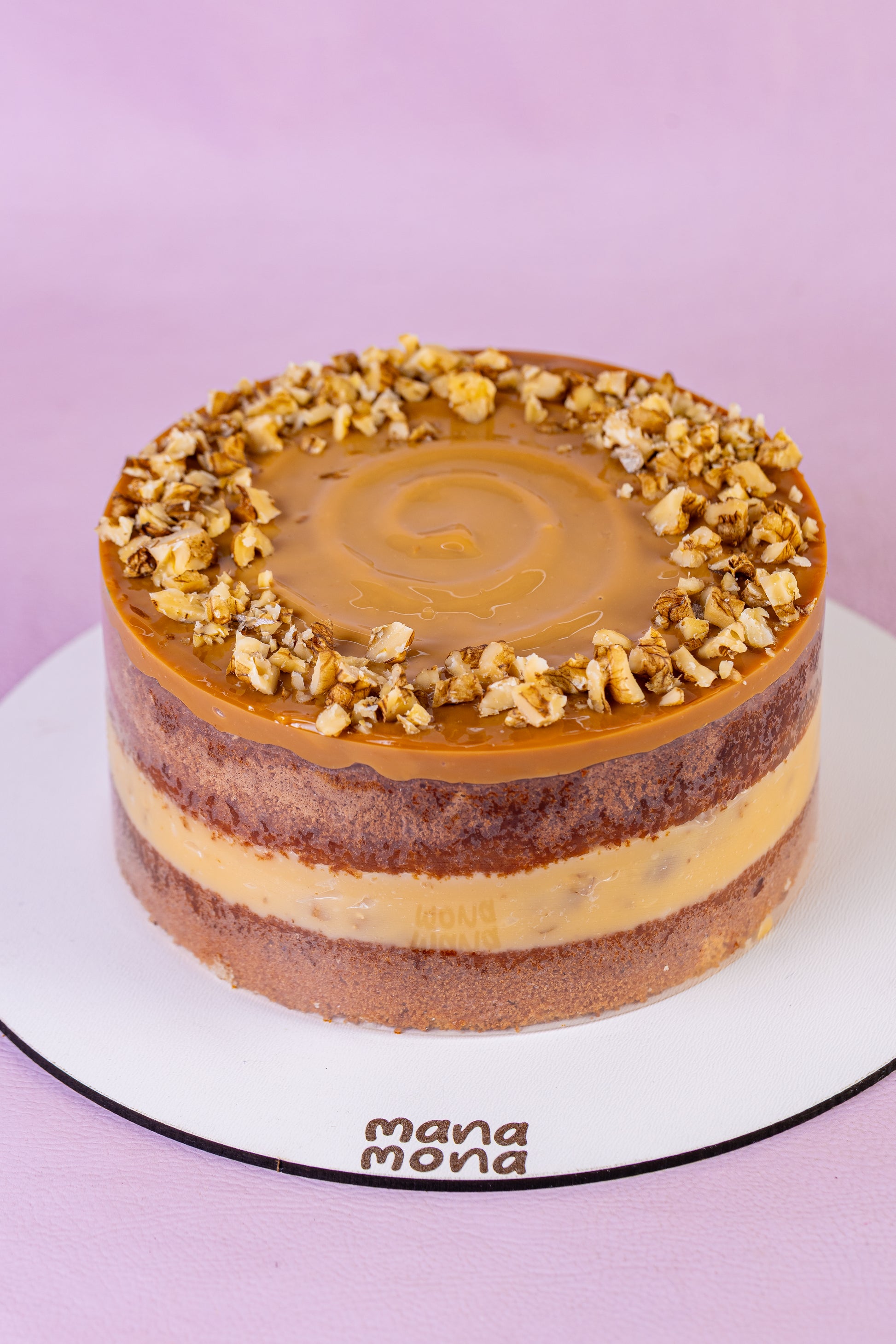 Massa de Baunilha com recheio de brigadeiro de nozes, finalizado com doce de leite caseiro e nozes caramelizadas.