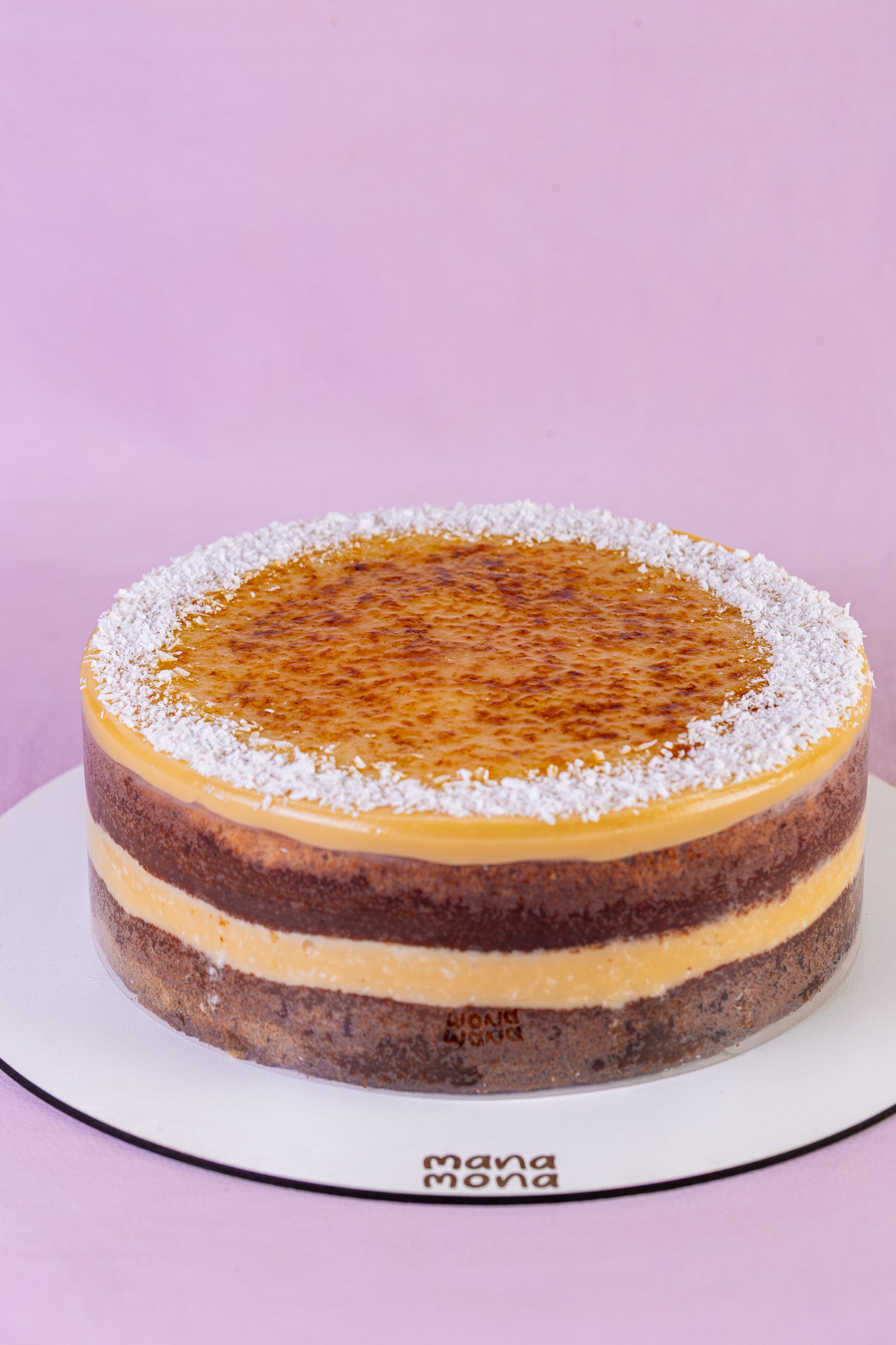 Massa de baunilha com recheio de cocada cremosa, finalizado com brigadeiro brulée.