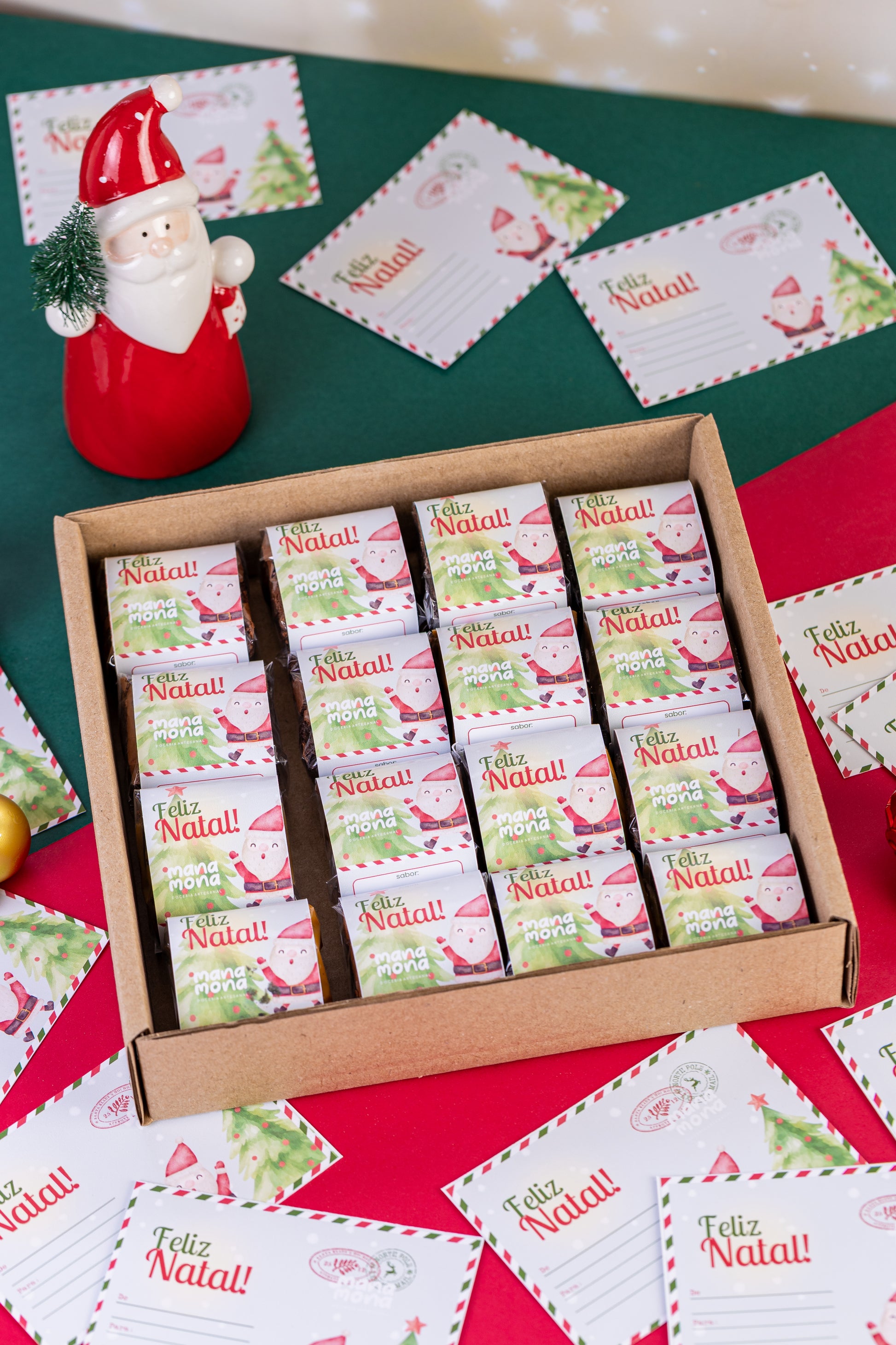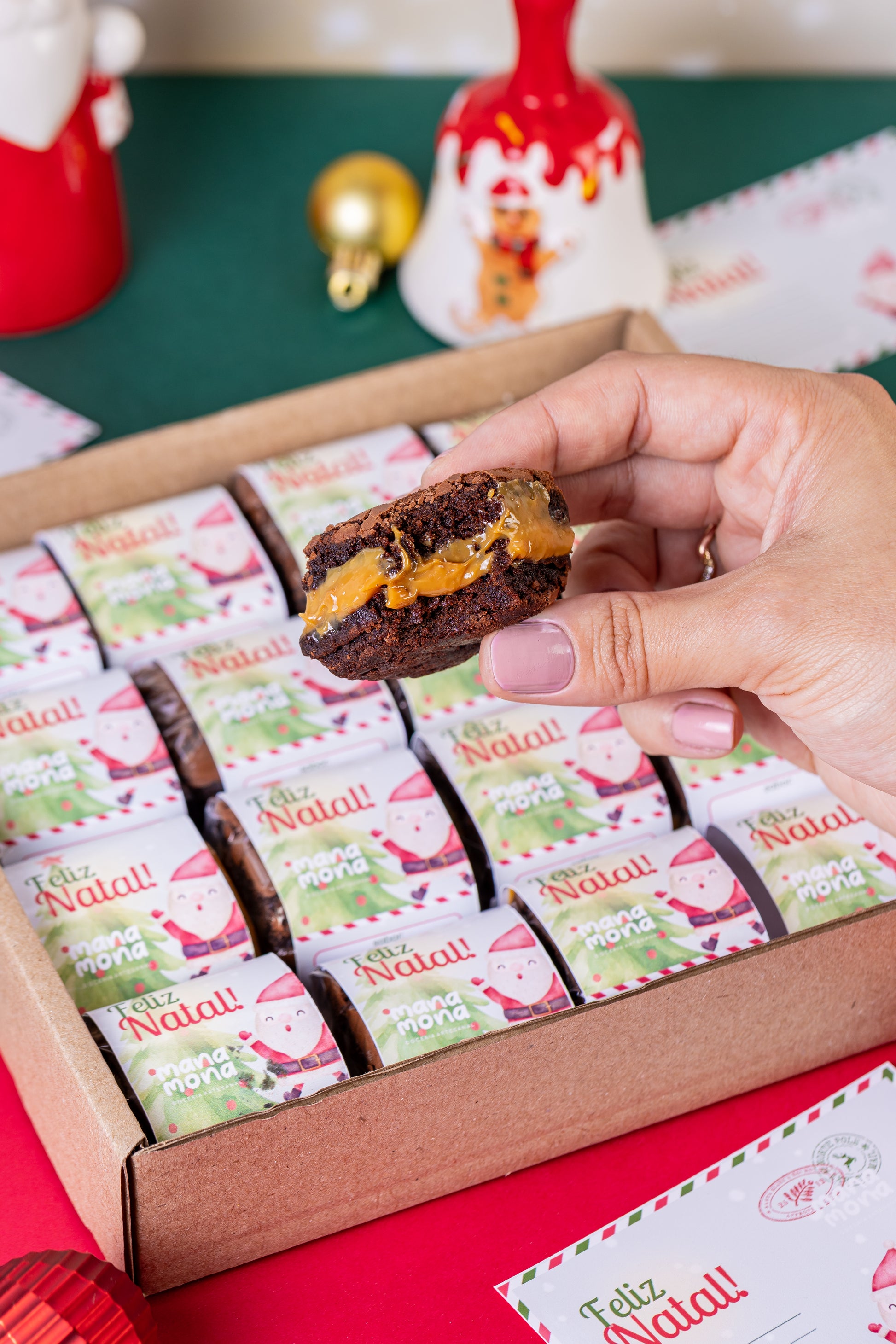 Uma caixa encantadora com brownies recheados embalados com o charme natalino e acompanhados de diversos cartões postais para trocar doçura e amor neste Natal com toda a família