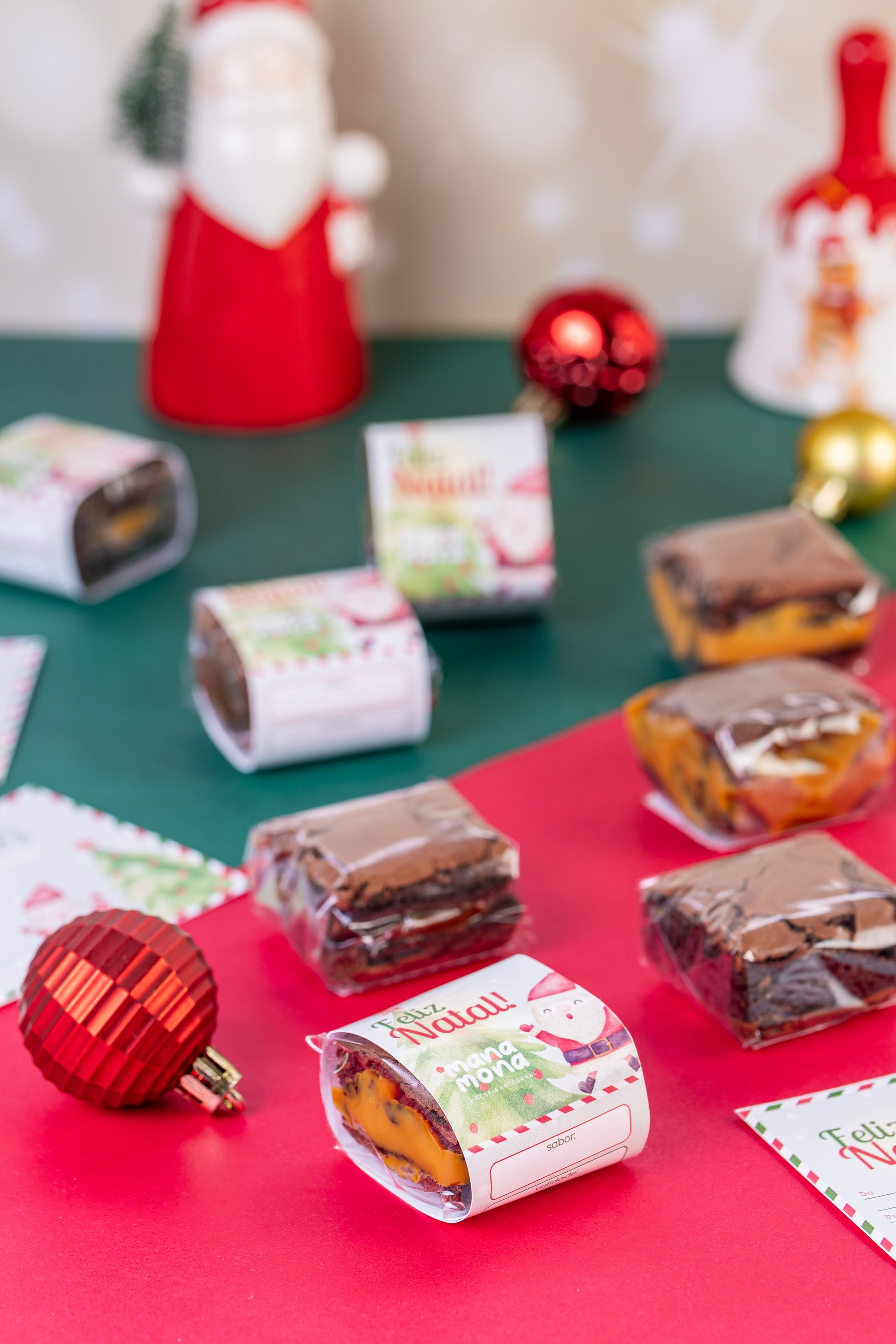 Nosso delicioso brownie (4x4cm) vai com uma cinta natalina e é ideal para dar de lembrancinha para todo mundo!