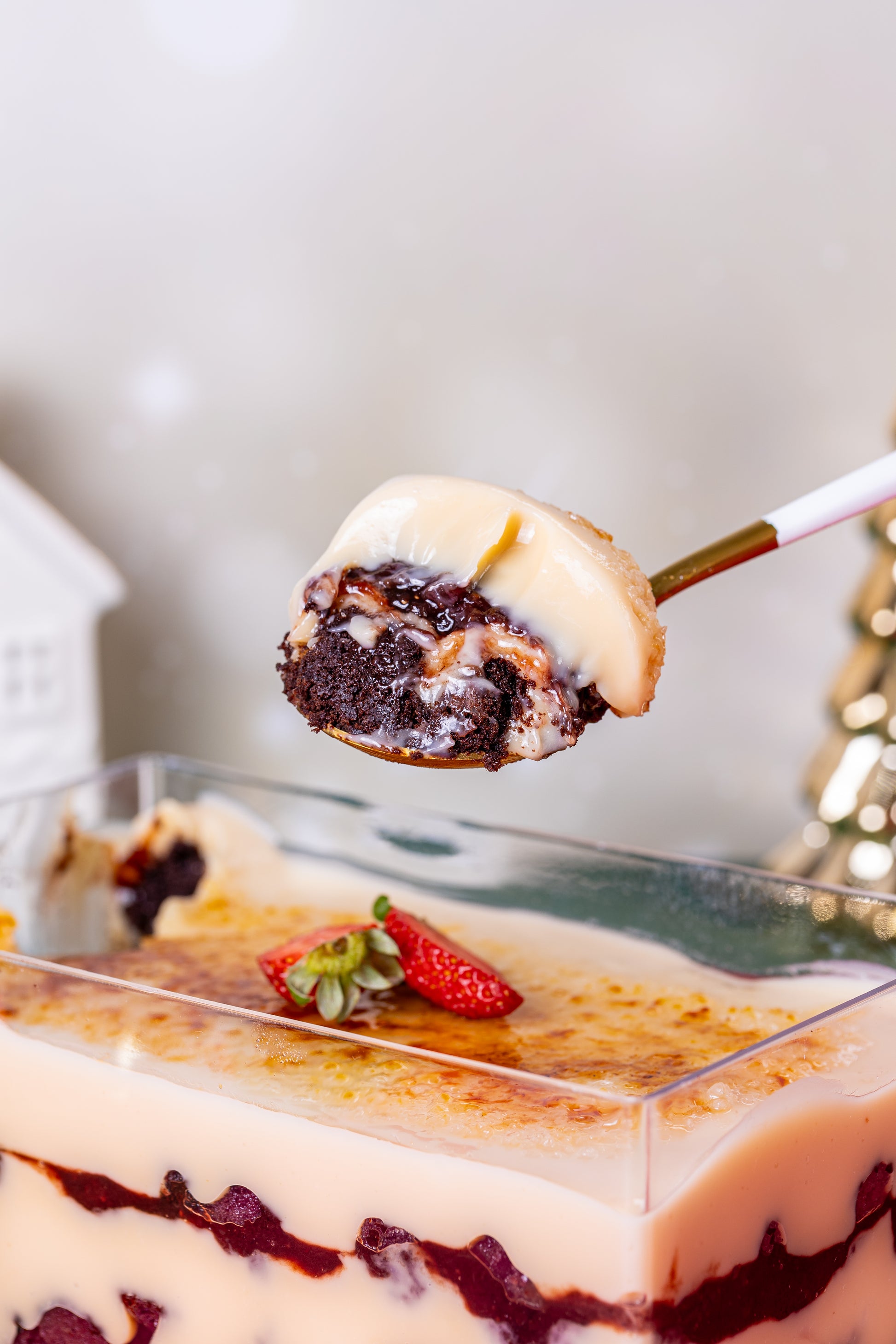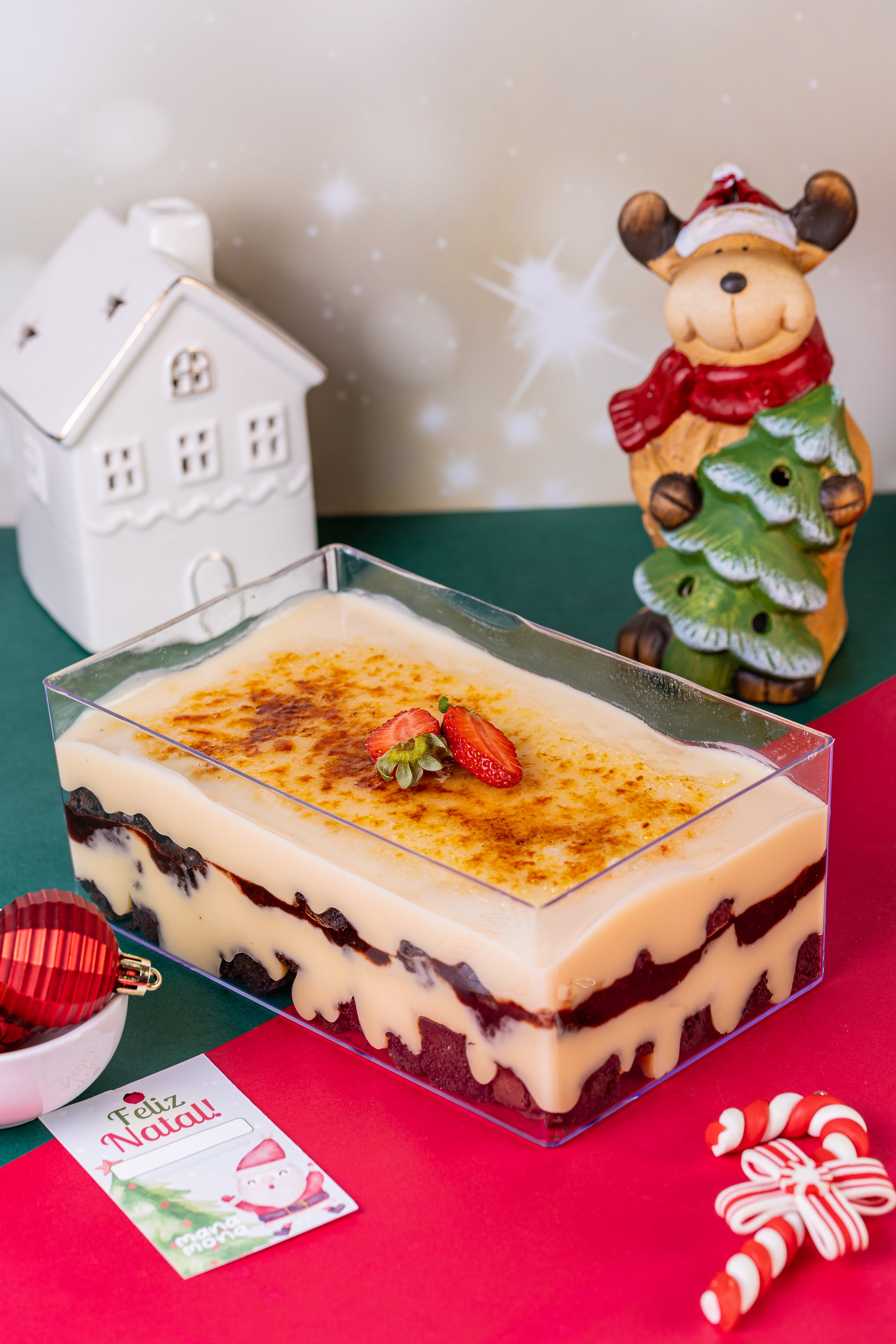 Camadas de brownie artesanal com creme branco aveludado, geleia artesanal de morangos e o toque final de uma casquinha crocante de açúcar brûlée.