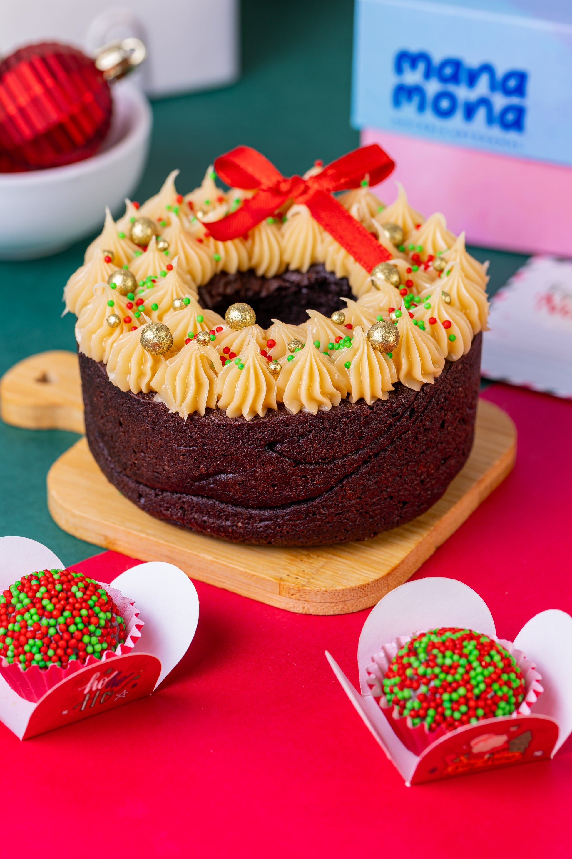 1 mini guirlanda de brownie com cobertura de brigadeiro branco acompanhada de 2 brigadeiros tradicionais de natal.