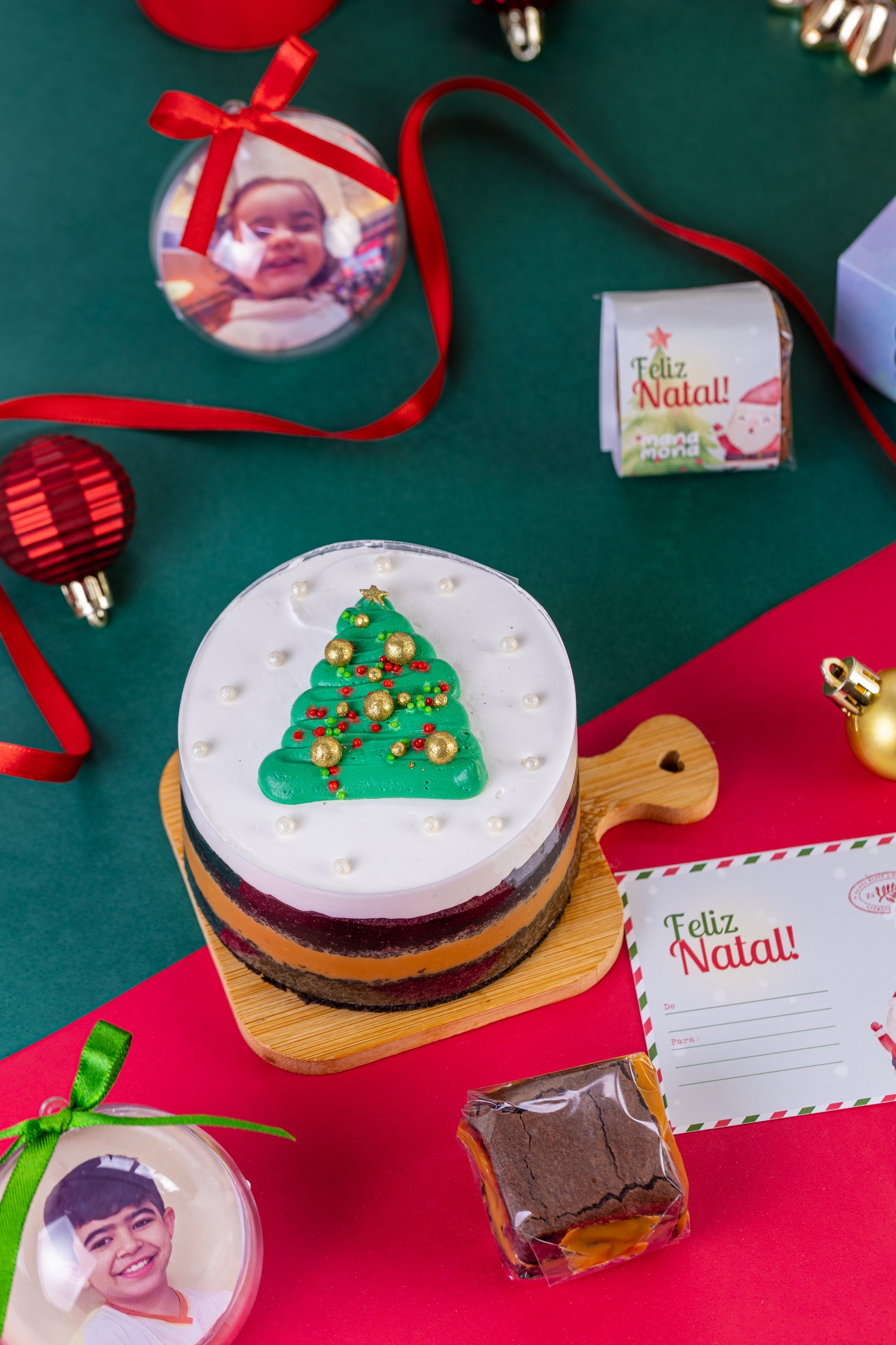 Mini bolo decorado,2 brownies recheados e 2 bolas natalinas personalizadas com a sua foto.